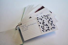 I recently decided that I would take stock of the stash and sort of catalogue it. I found these index cards that came already on a ring and knew that they would be perfect for this little project. Each card has a small swatch of the fabric with any content information and how much of it I have. I love this set up!